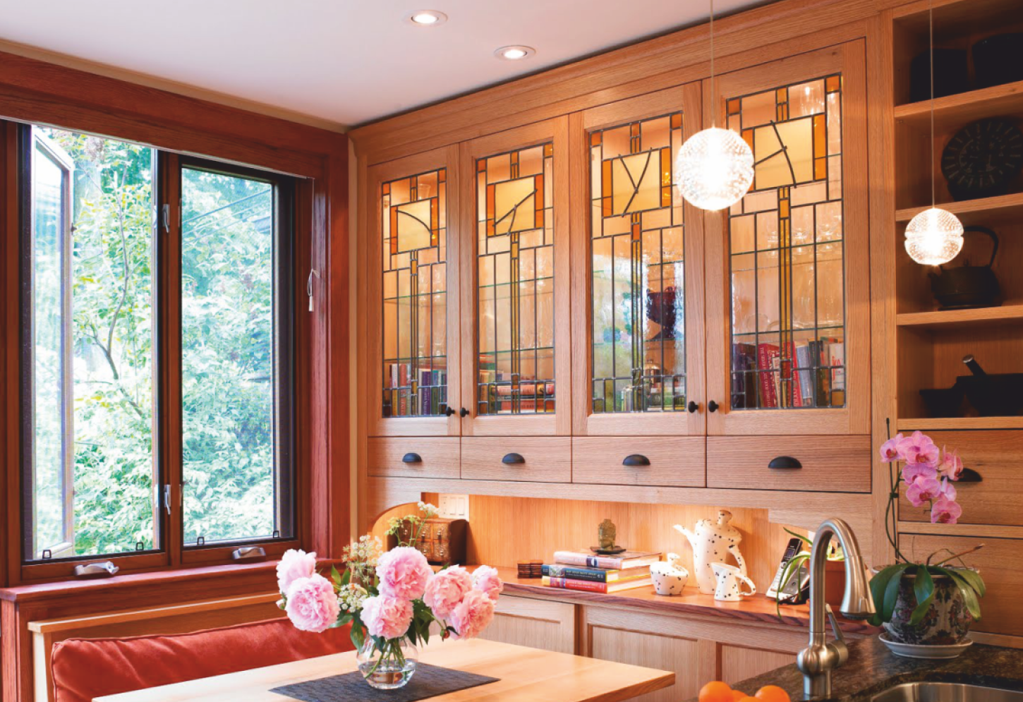 Существует несколько технологий изготовления стеклянных витражей для кухонных фасадов. Выбор способа зависит от стиля гарнитуры, особенностей конструкции шкафов и сервантов. Витрины бывают фигурноизогнутыми, вогнутой или радиусной формы.
